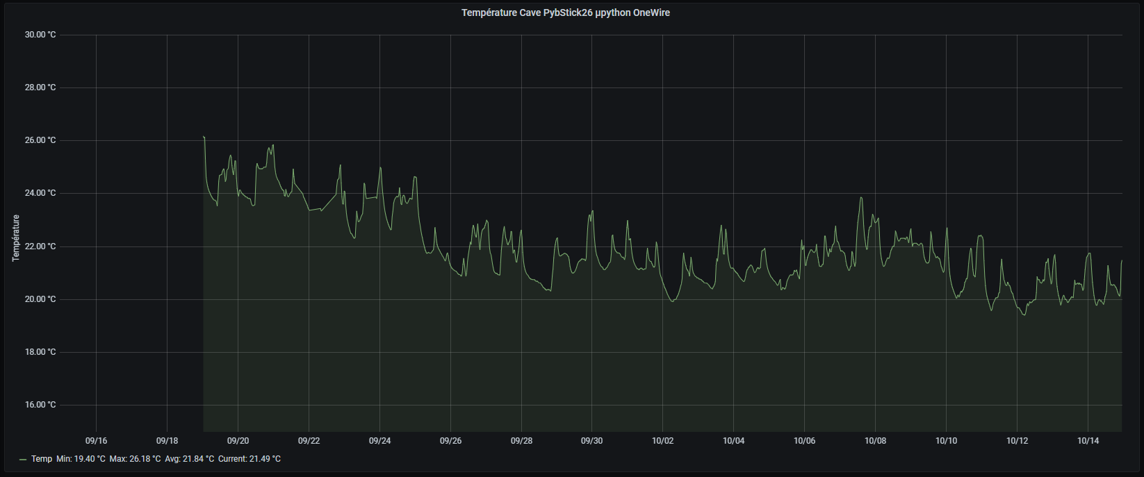 Pour tester la fiabilité j'ai connecté un capteur 1Wire DS18B20 dont je logue la mesure dans une base Influx via Ethernet.