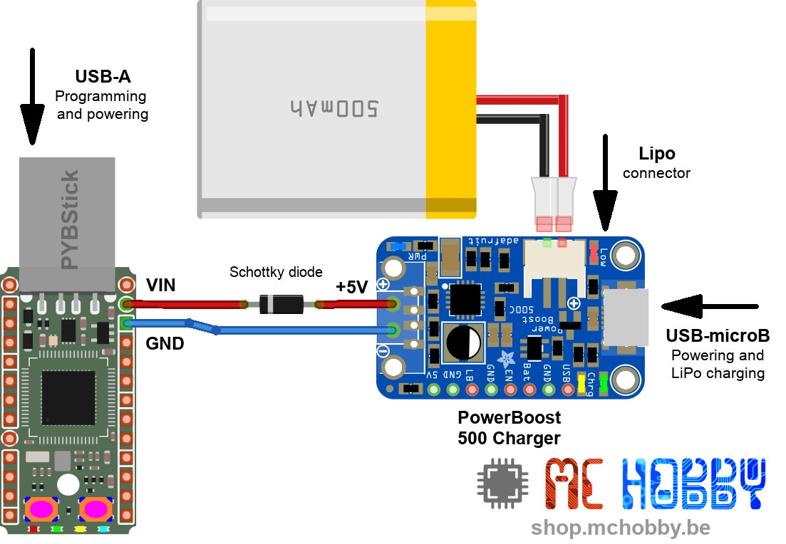 - La PYBStick ne se décharge pas dans le PowerBoost grâce à la diode Schottky (entre la PYBStick et le PowerBoost).