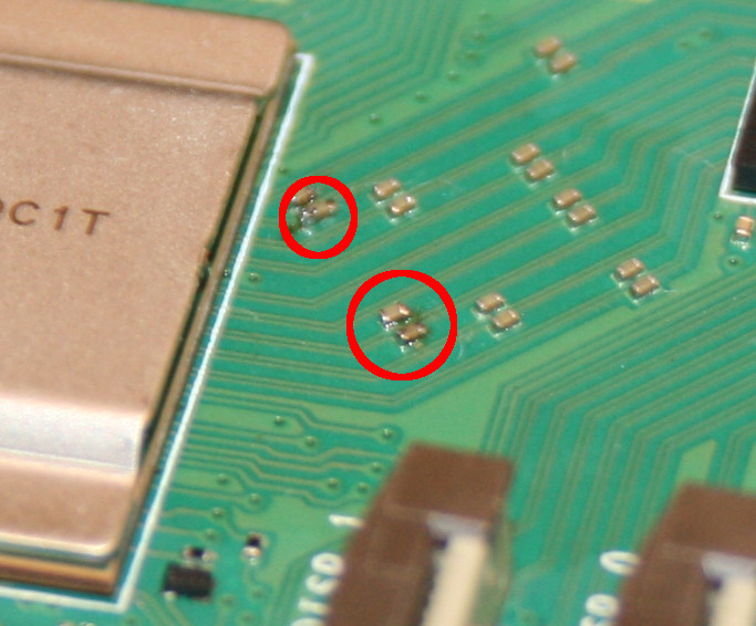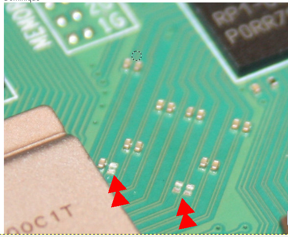 Dans le cas présent des composants ont étés arrachés (durant l'installation du ventilateur) sur les pistes PCI Express du RP1.
